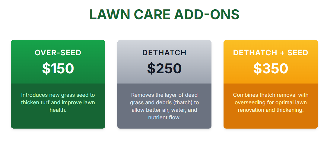 - Includes Spring Aeration, 3 seasonal fertilizers, and overseeding